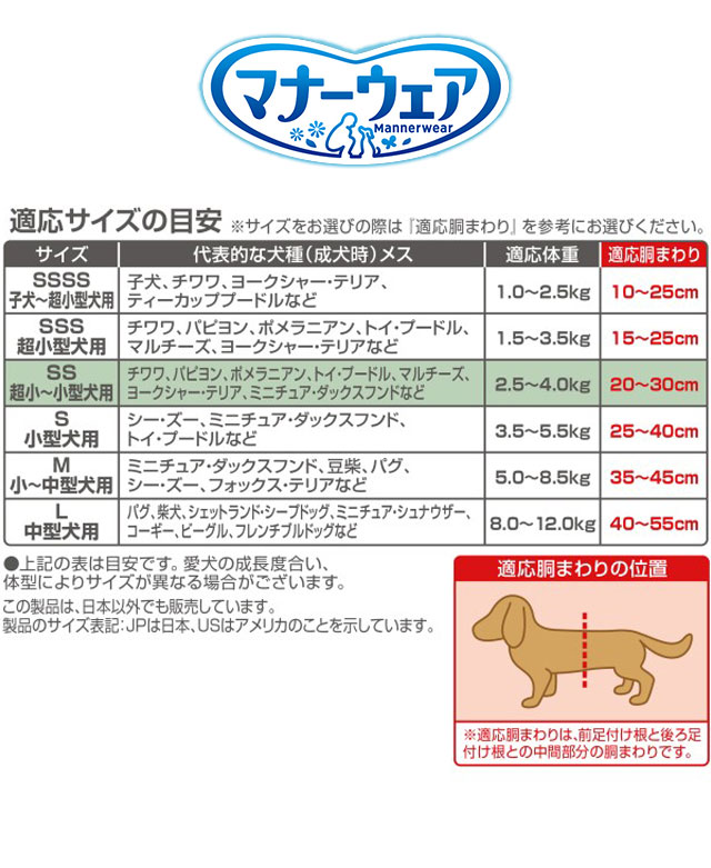●お使いになる前に使用上の注意を必ずお読みになり、使用中はこの袋を保管してください。●本品は取り出し時に製品同士がくっついて出てくる場合がありますが、品質上問題はございませんので、安心してご使用いただけます。●本品は使い捨ての紙オムツですので、洗濯しないでください。●万が一、製品の中身が人の目に入った場合は流水で洗い流し、医師にご相談ください。動物の目に入った場合は、獣医師にご相談ください。●本品は切って使用すると、中身が飛び散ったり、汚れやモレの原因となる為、そのままで使用してください。●本品は食べられないので、飲み込まないでください。●万が一、飲み込んだり吸い込んだりした場合は、医師や獣医師にご相談ください。●テープは皮膚・被毛につけないでください。●万が一、身体に異常を感じた場合はご使用を控え、医師や獣医師にご相談ください。●特に肌が弱い場合やアレルギー体質の場合は、使用に十分注意してください。※本品は愛犬の体調や尿量、使用環境によっては機能が十分に発揮できない場合があります。※香料はマナーウェアの外側の不織布部分に塗布をしています。