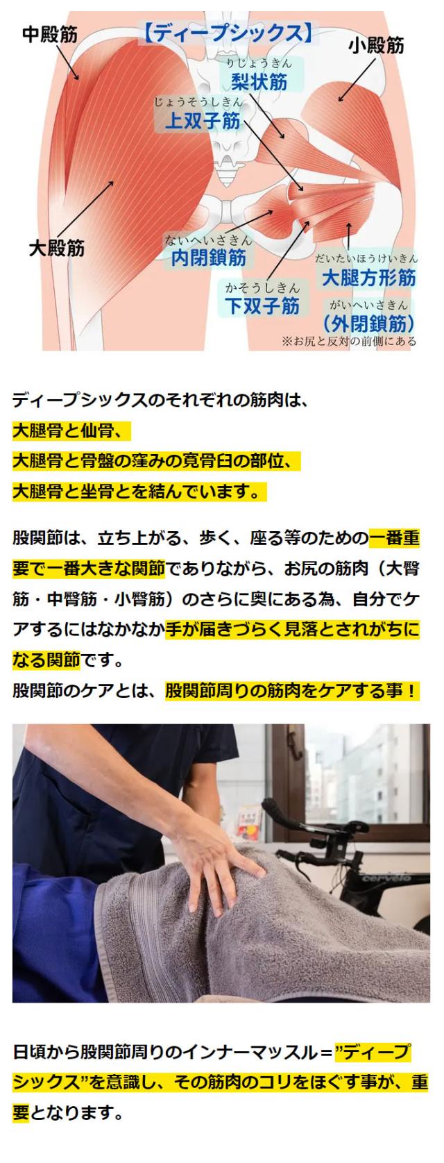 股関節をまたいで大腿骨などに直接繋がっているインナーマッスルで、特に重要な6つの筋肉の事を、ディープシックスと呼びます。