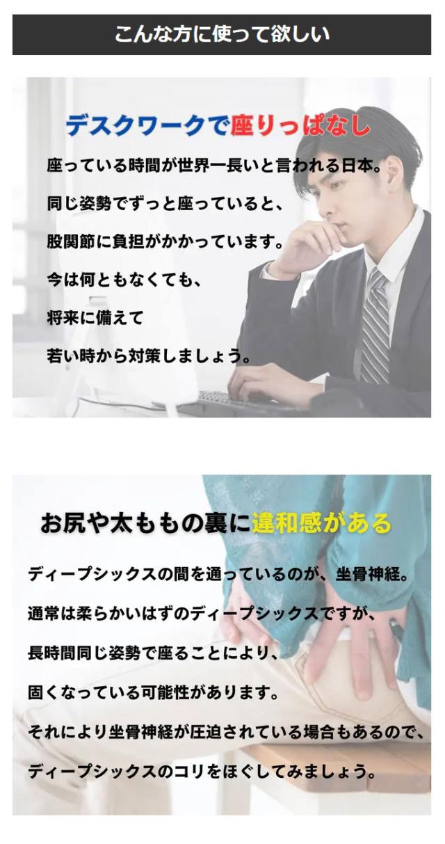 座面の6つの突起は、座ったときにちょうど股関節周りのインナーマッスルの位置に来るように設計されています。