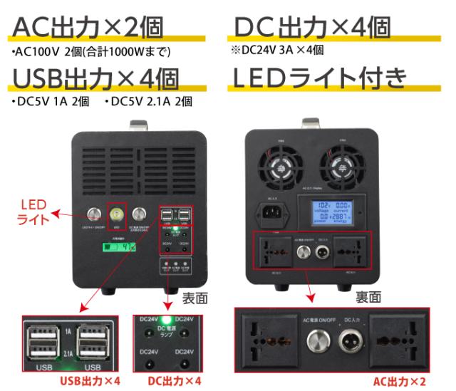 ・定格出力:AC/100V 60Hz(2ポート)・USB/1A(2ポート) 2.1A(2ポート)・DC/3A(4ポート)