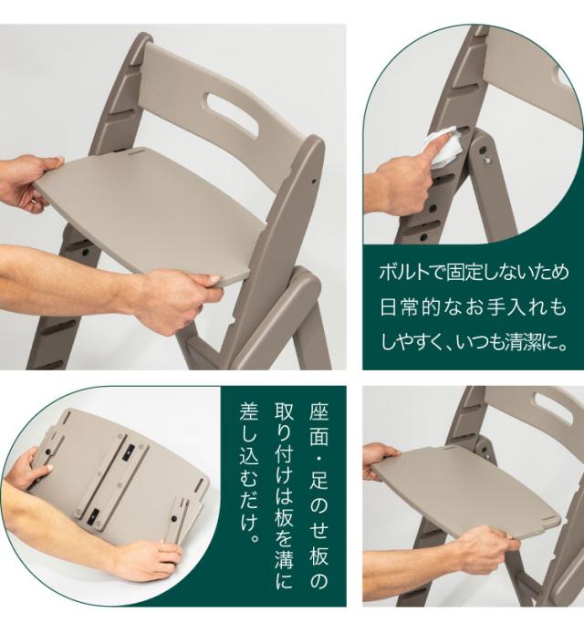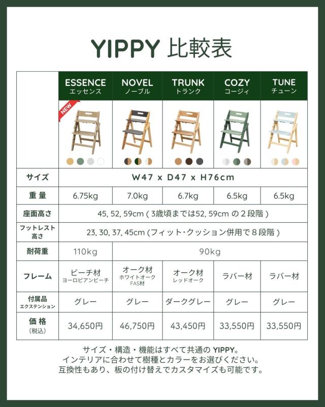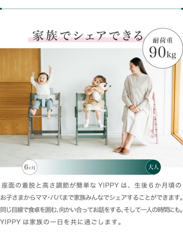 座面の着脱と高さ調節が簡単なイッピーは生後6か月頃のお子さまからママ・パパまで家族みんなでシェアすることができます。