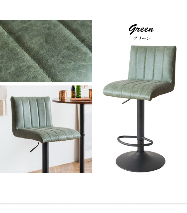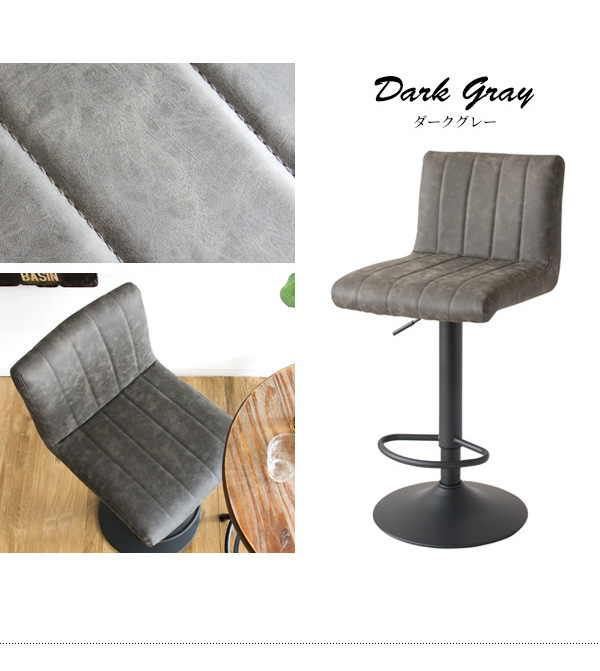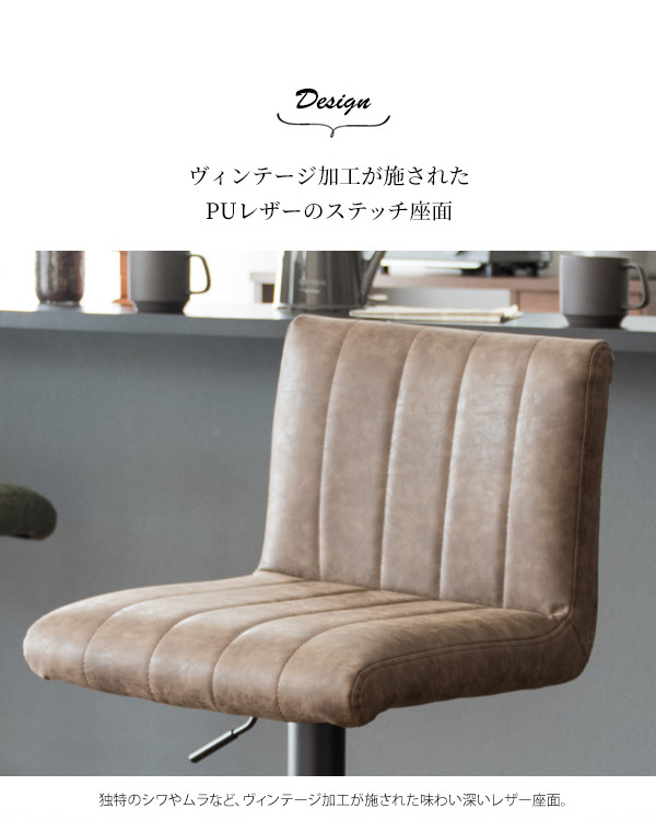 縦に入ったステッチとヴィンテージ加工が目を引くレザーの座面とシックな砂目調のフレームで、レトロな雰囲気を演出するバーチェア『Passe(パッセ)』。
