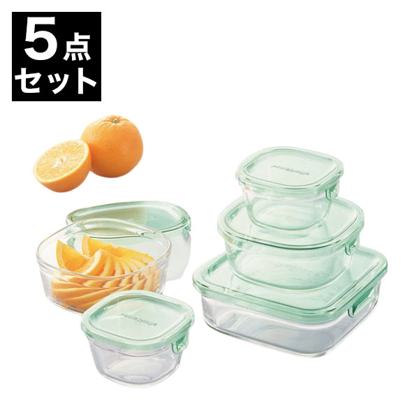 イワキ iwaki 耐熱ガラス 保存容器 グラスコンテナ 角型5点セット グリーン PSC-PRN-5G 電子レンジ対応 食洗機対応 シンプル【送料無料】