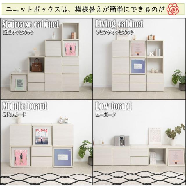 階段状にしたり、アイランドカウンターのような間仕切りにしたり、壁面に積み上げたり、ロボードとしてもどんな姿にもなる。『使える』 をし っかりサポートした扉・引出し・オープン・レコ ードタイプとボックスデザインを損なわないキュ ーブ型に仕上げました。