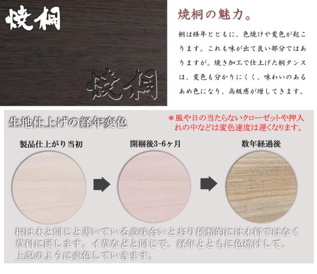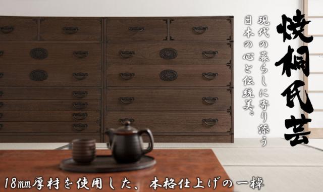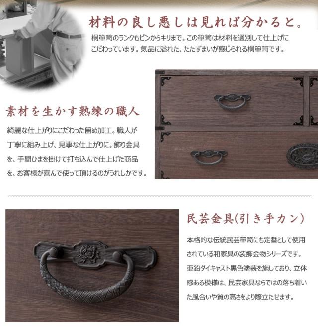 ■商品の仕様/本体:天然木桐材(焼き仕上げ)、引出し底板・背板:天然木桐化粧板、民芸金具:亜鉛ダイキャスト
