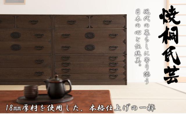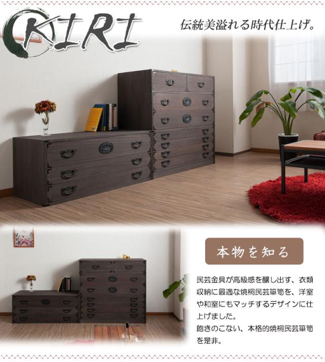 ■商品について/現代の暮らしに寄り添う日本の心と伝統美を落とし込んだ焼桐民芸箪笥【Jidai】時代シリーズ。表面をバーナーで焼き付け凹凸感を炙り出した重厚感ある仕上げ。マットブラックが光るどっしりとした装飾金物をあしらい個性をしっかりと演じています。3段・5段・7段をラインナップし重ねて使えば収納量はもちろん大迫力の存在感。桐材は内部を一定の湿度に保とうとする働きがあるので大事な着物や洋服などを湿気から守る桐箪笥にしまうのがベスト。その名の通り『時代』を超えて愛着の湧く飽きないデザインが魅力。