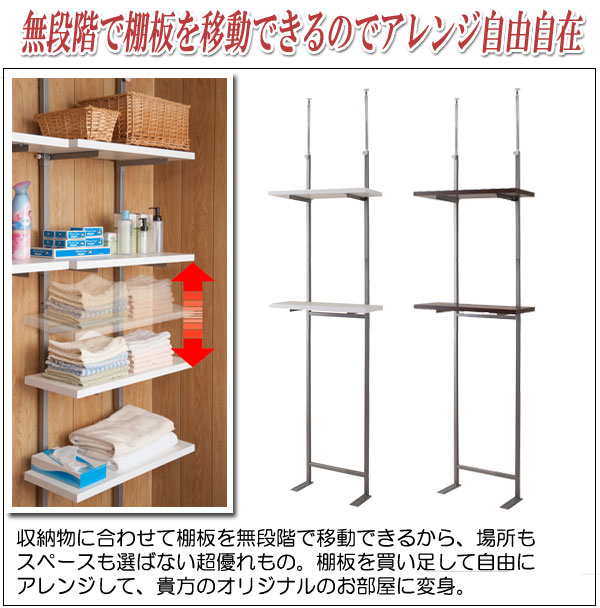■商品について/無段階に棚板の位置を調節できる突っ張りウォールシェルフが新たに登場!前回とは違い棚板の位置を無段階に調節できるから自分の丁度いい高さにすることができます!キッチンで食器や保存食を、リビングで雑誌やDVDを、ランドリーではバスタオルのストックや洗剤を置いたり。