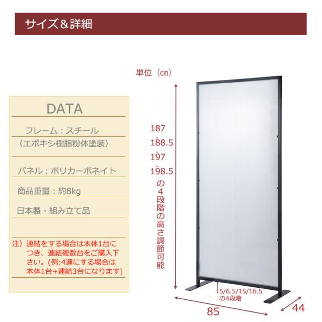 本体:(約)幅85×奥行2.5(脚部44)×高さ(4段階調節可能)187・188.5・197・198.5(下部隙間5・6.5・15・16.5)cm