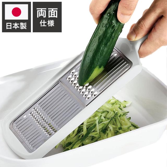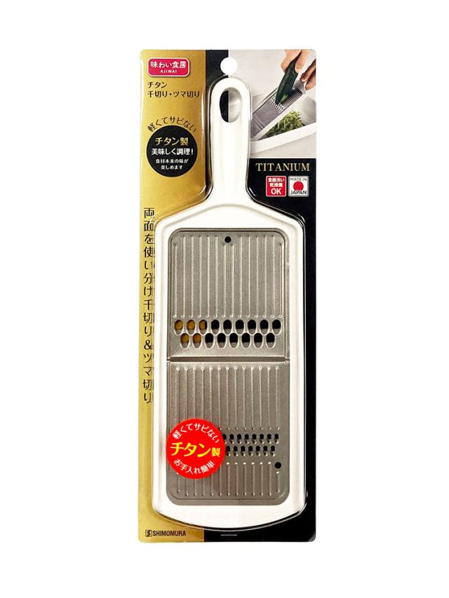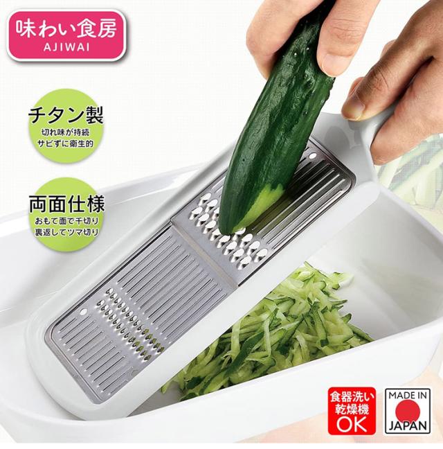 にんじんや大根、きゅうり等の千切りやツマ切りにご使用頂けます。両面を使い分けて野菜の千切り&ツマ切りができます。刃はサビにくいチタン製で衛生的です。食器洗い乾燥機に対応します。