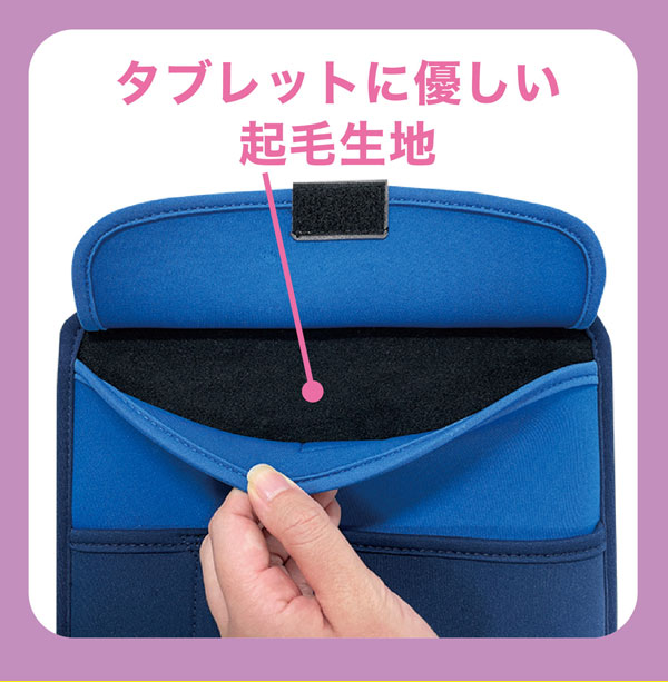 ●前ポケットに充電ケーブル・タッチペン・イヤホン等が入り、背面はファイル仕様になっておりB5サイズのプリントやノートも入れられる