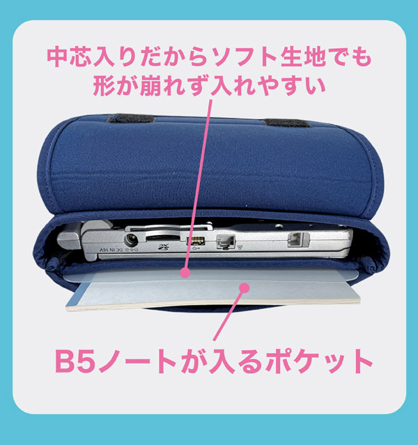 ●前ポケットに充電ケーブル・タッチペン・イヤホン等が入り、本体にはB5サイズのプリントやノートも入れられる