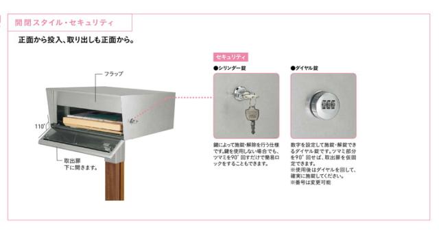 サインや受領印を必要としないメール便を不在時でも受け取れます。配達時間を気にする必要がありません。開閉スタイル:正面から投入、取り出しも正面からとなります。セキュリティ:数字を設定して施錠・解錠できるダイヤル錠です。ツマミ部分を90°回せば、取出扉を仮固定できます。使用後はダイヤル錠を回して、確実に施錠してください。番号は任意で設定可能です。