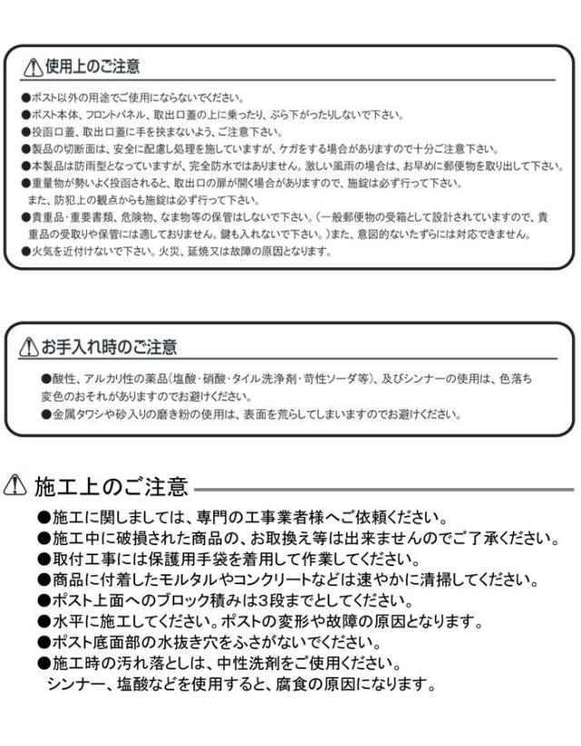 ポスト前面部、本体部底面の水抜き穴をふさがないでください