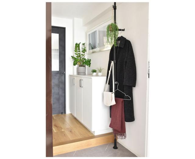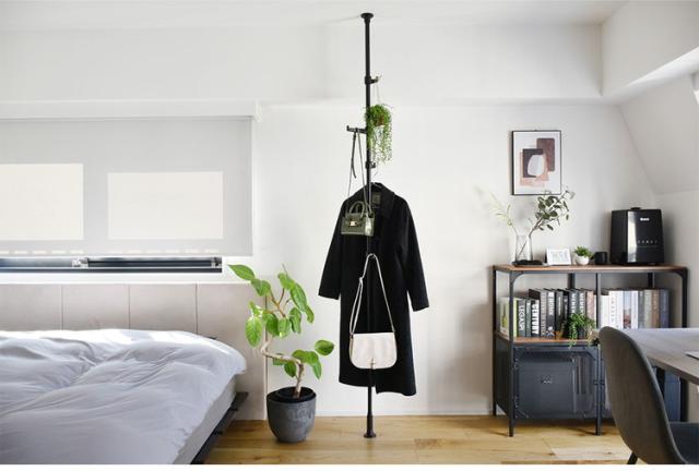 ・つっぱり棒を縦方向に使うハンガーラックです。高さが自由に調整できるため玄関やリビングのちょっとしたスペースを有効に活用いただけます。