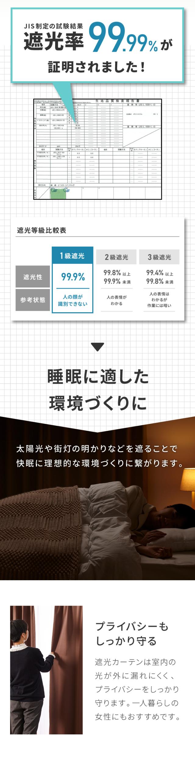 さらに、光を99.99%遮る1級遮光カーテン。真っ暗にして寝たい方におすすめ!