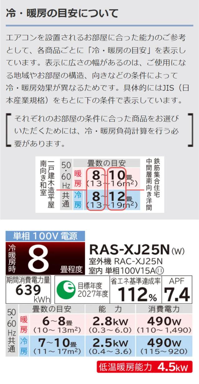 | RAS-XJ22N/6畳 | RAS-XJ25N/8畳 | RAS-XJ28N/10畳 | RAS-XJ36N/12畳 |
