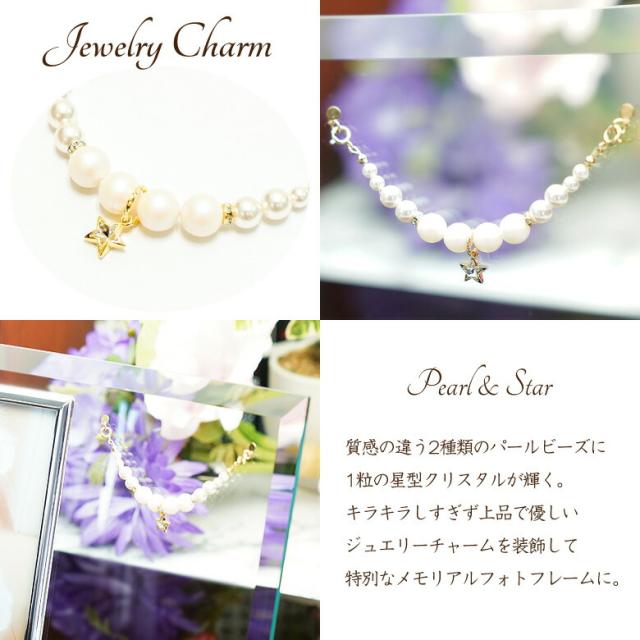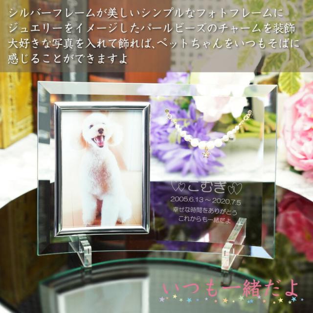 説 明 | シルバーフレームが美しいガラスフォトフレームに、パールビーズのジュエリーチャームを装飾したペットメモリアルです。 |