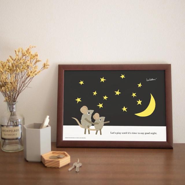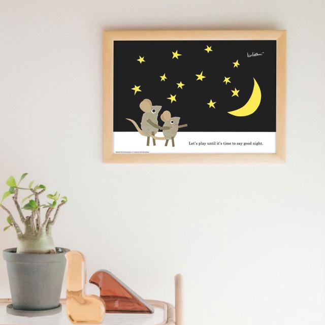 このポスターは、夜空を背景にした星と月、そして二匹の遊ぶネズミが描かれており、子供部屋やリビングなど、家のどの部屋にもぴったりのアートピースです。