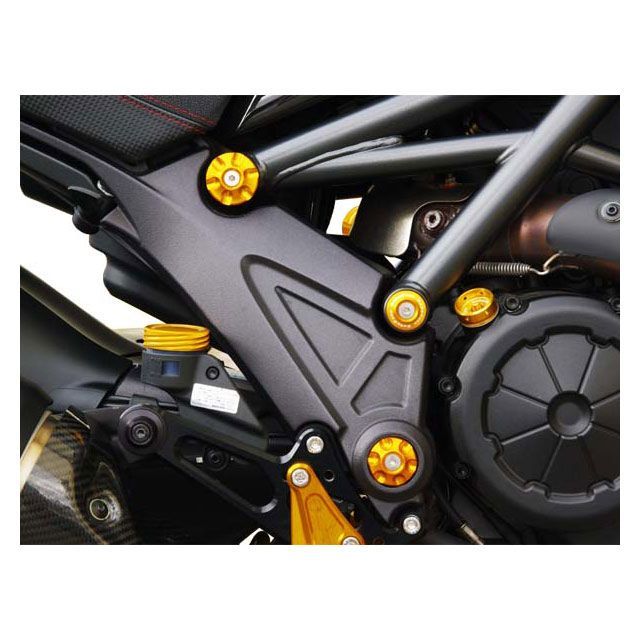フレームのピボットホールをカバーし、雨滴等の浸入を防ぎ、ピボット部分の汚れや錆びの発生を防止します。またアピアランスアイテムとして、フレームのワンポイント的なアクセサリーにも最適です。左右、スイングアームピボット用×2個と、フレームピボット用×4個の、6個セットです。カラーはブラック、ゴールド、シルバーから選んでいただけます。
