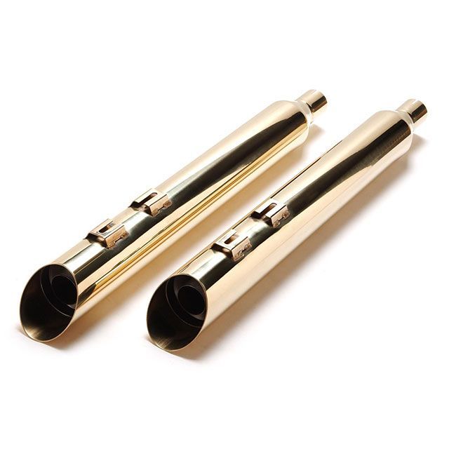 ブラスマフラーはノーマルエキパイにスリップオン取付です。マフラー本体の外殻部に他に類を見ない管楽器と同じ真鍮素材を採用。肉厚の真鍮素材と独自のインナーサイレンサーでハーレーらしい重低音でキレのある音質を実現。インナーサイレンサー側面の穴径を変えることで音質、音量を変更することが可能。インナーサイレンサー穴径は4mm、6mm、8mm、10mm、12mm、遮蔽版のないオープン、他規制対応タイプをラインナップ。FLD/15〜FXDLは標準で12mmが装着されています(規制外)。車種別専用ステーが同梱されておりますので、マフラーのセットのみでボルトオン装着可能です。