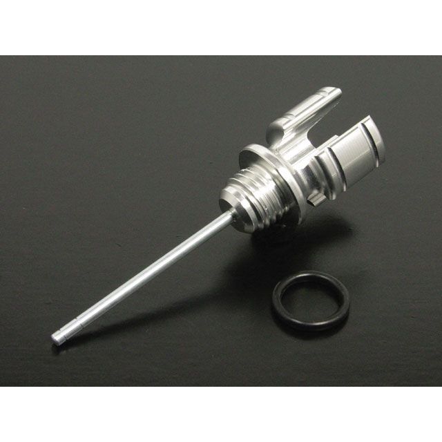 アルミを大胆に削り込み、存在感と指先での回しやすさを両立したオイルレベルゲージです。