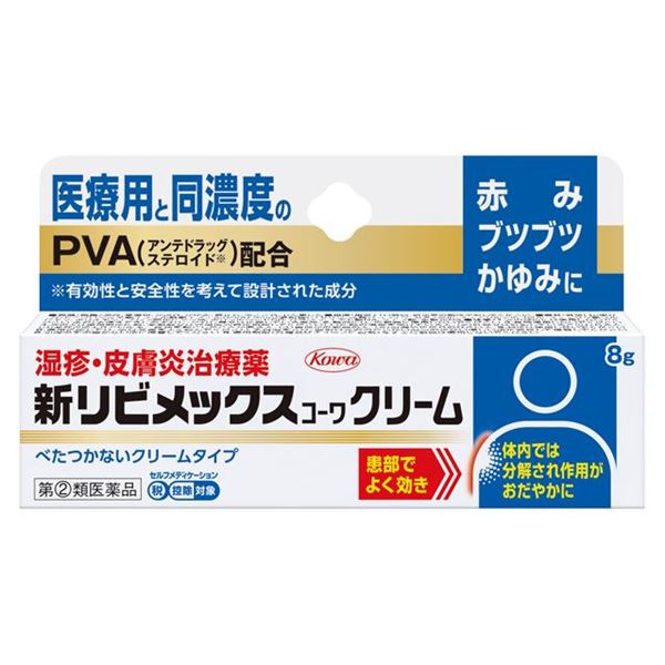 「新リビメックスコーワクリーム 8g」は、すぐれた抗炎症作用を有するPVA(プレドニゾロン吉草酸エステル酢酸エステル)を医療用と同濃度の0.3%配合。PVAは、患部ですぐれた効果を発揮したあと、体内では分解され作用がおだやかになる、有効性と安全性を考えた治療薬です。クリーム剤なので、カサカサした「乾燥型」、ベタつきが苦手な方に適しています。