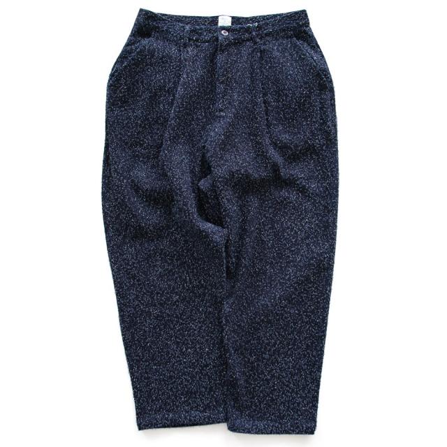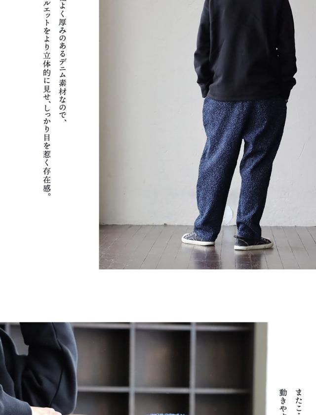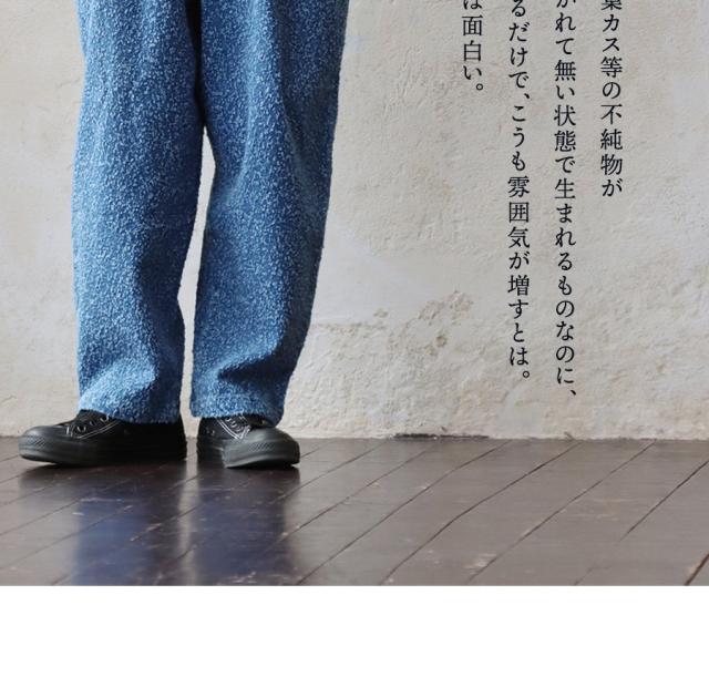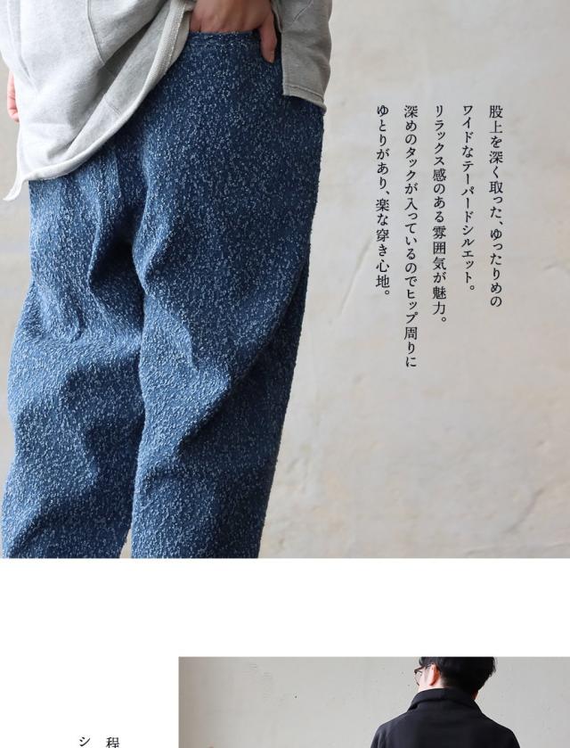・柄モノのような独特の風合いを持つ、ワイドなテーパードパンツ。