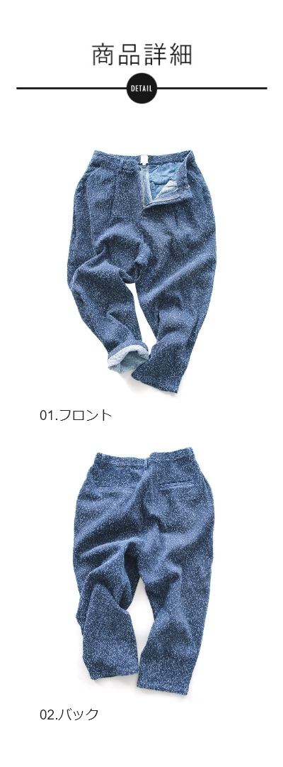 ・股上を深く取った、ゆったりめのワイドなテーパードシルエット。リラックス感のある雰囲気が魅力。