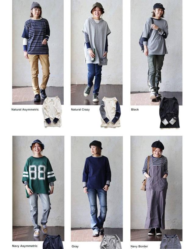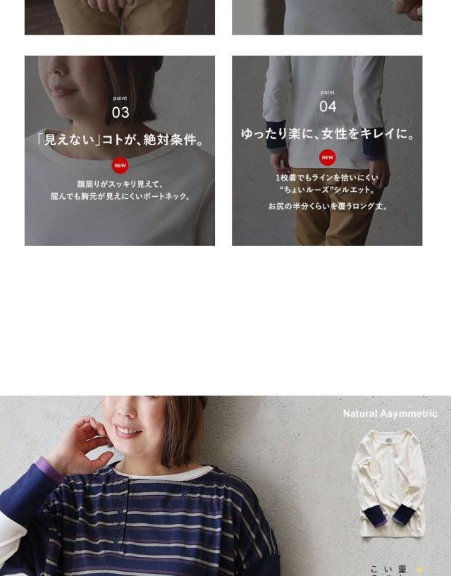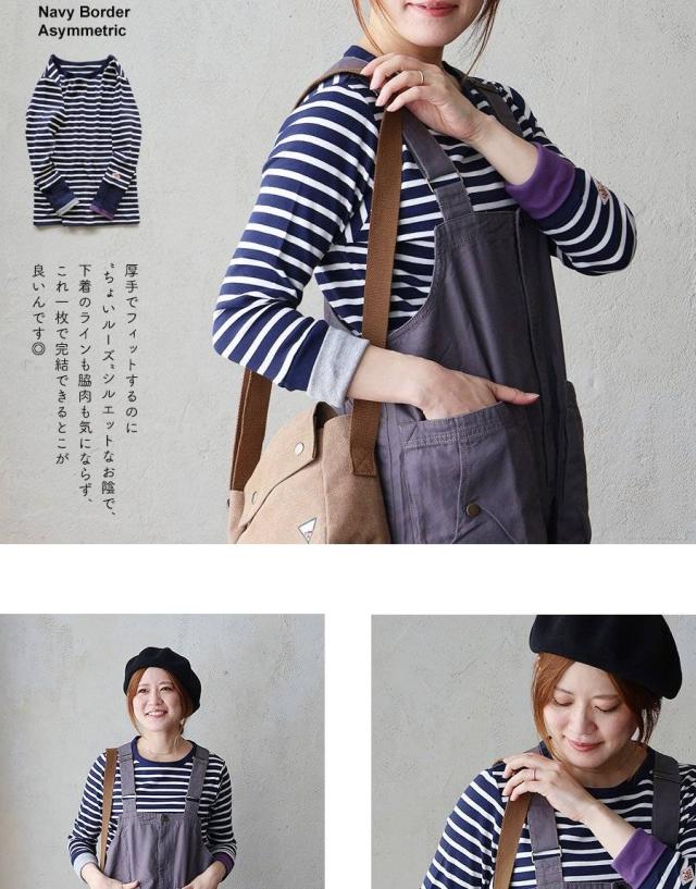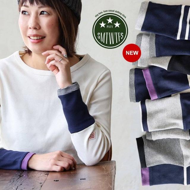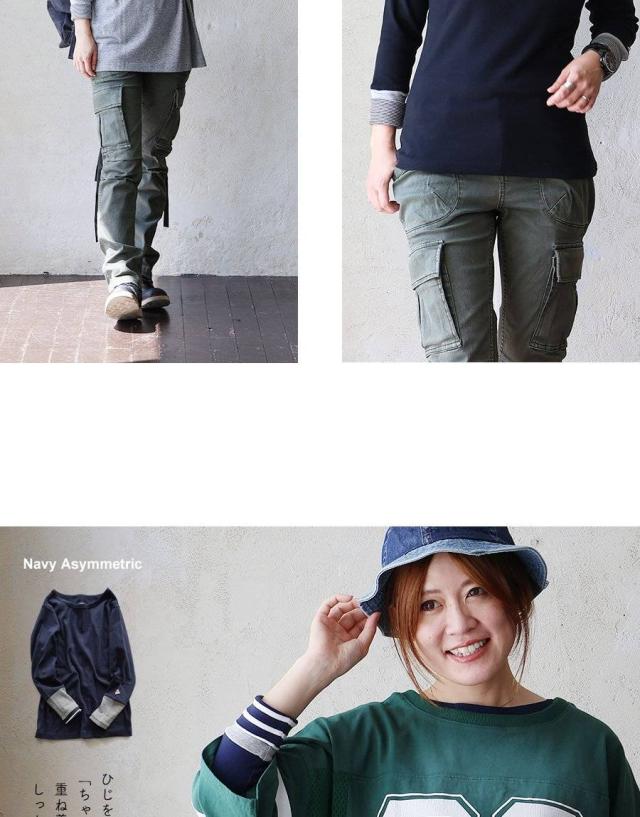 【メール便50】 カットソー 重ね着 長袖 レディース モックネック 袖切り替え しっかり 丈夫 綿100% コットン ストレッチ 大きいサイズ ロングtシャツ スリムフィット インナー 洗濯に強い クレイジー アシメ 配色 リブ ボーダー 大人 カジュアル パティ PATY パティ