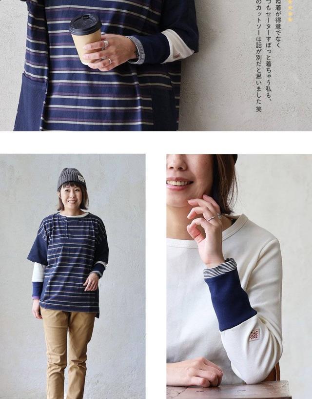 カットソー 重ね着 長袖 レディース モックネック 袖切り替え しっかり 丈夫 綿100% コットン ストレッチ 大きいサイズ ロングtシャツ スリムフィット インナー 洗濯に強い クレイジー アシメ 配色 リブ ボーダー 大人 カジュアル パティ
