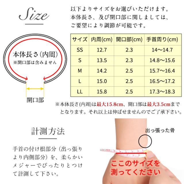 内周:約15.0cm 開口部:約2.5cm 手首回り16.5〜17.2cm