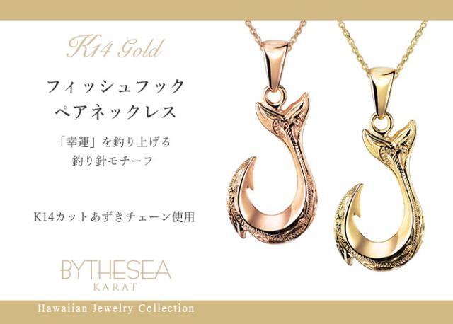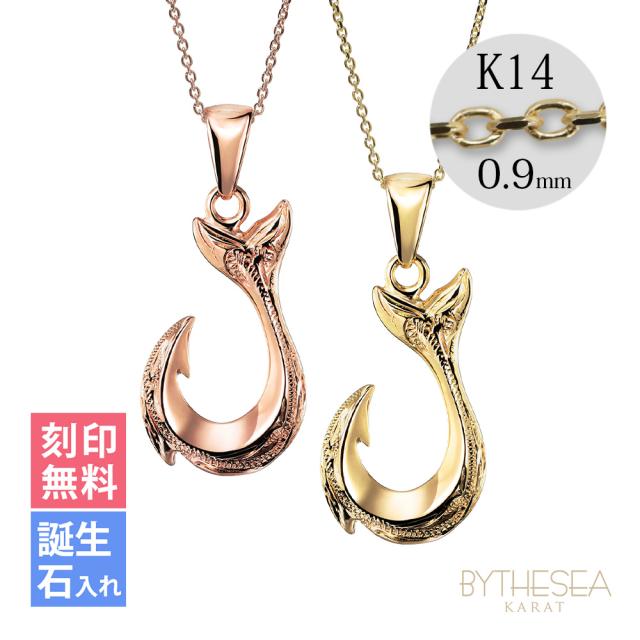 ゴールド ネックレス ハワイアンジュエリー フィッシュフック モアナ ペアネックレス 2本セット 刻印 無料 誕生石入れ可 幸せを釣上げる 14K K14ゴールド 14k k14カットあずきチェーン太0.9mm 2本セット ネックレス カップル プレゼント クリスマス 【品番:CG-GP113P-CH123】