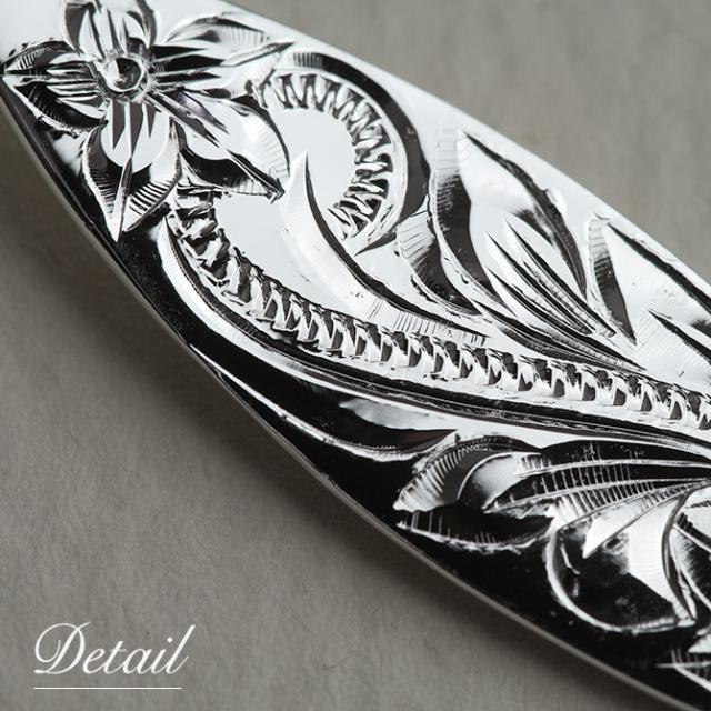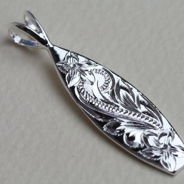 良い波に乗れるように願いを込めて、スクロールとプルメリアが前面に刻まれたペンダントです