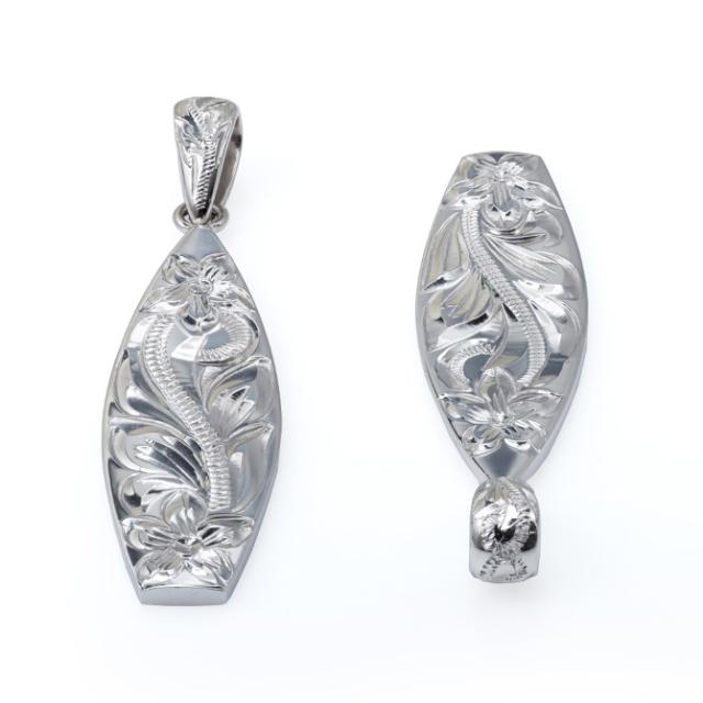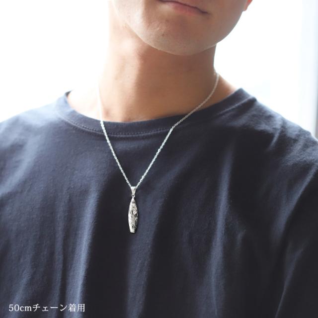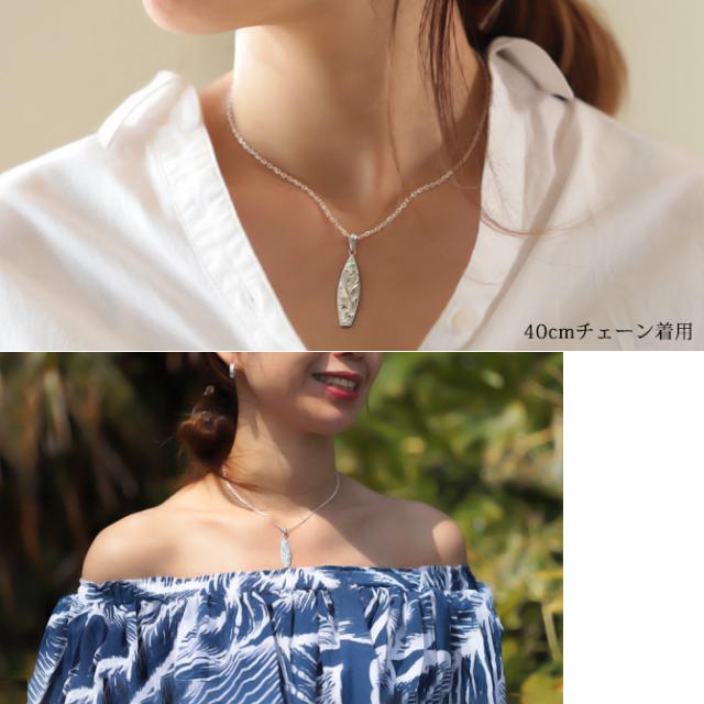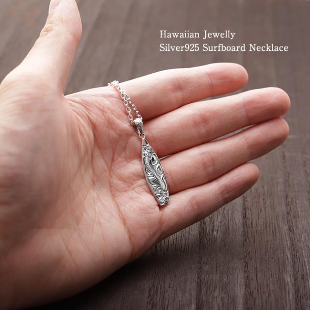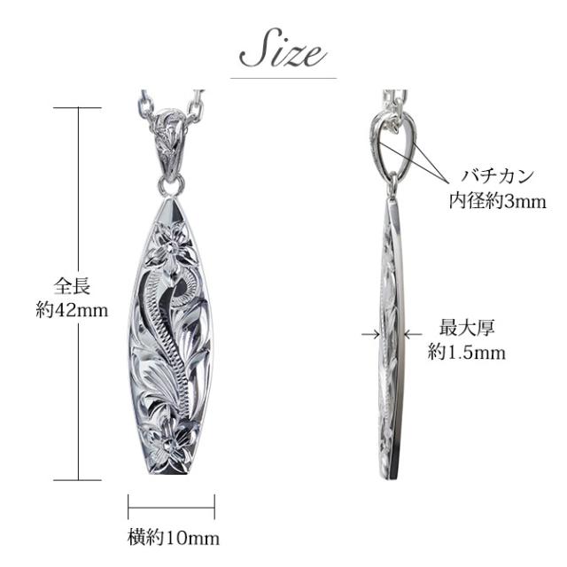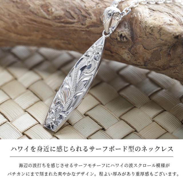 ハワイを身近に感じられるサーフボード型の爽やかなネックレス。バチカンにまで刻まれたスクロール模様と程よい厚みが特徴です。