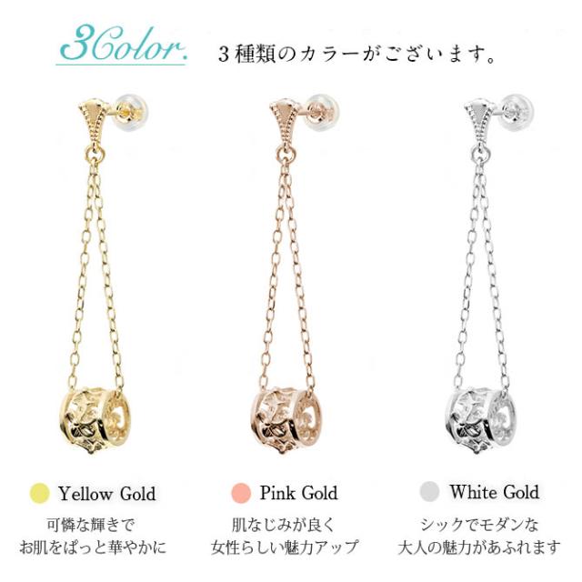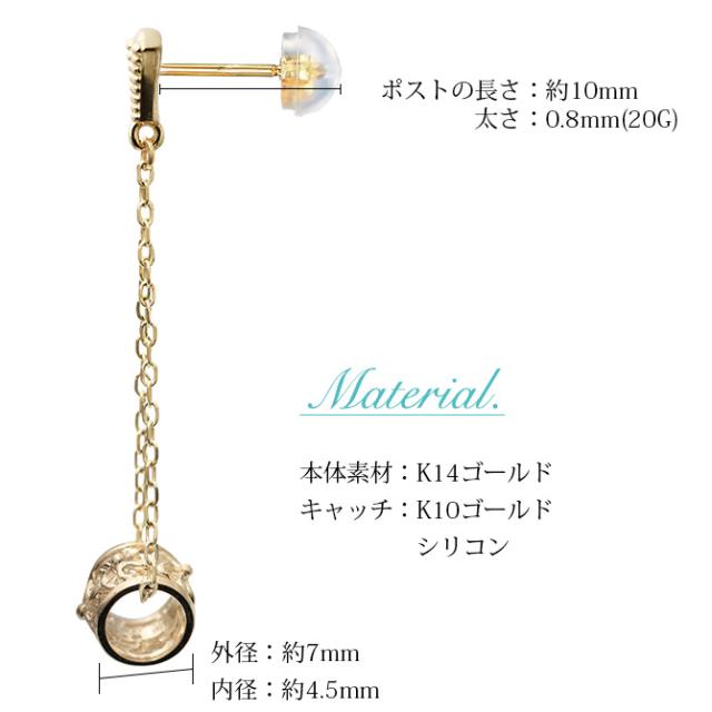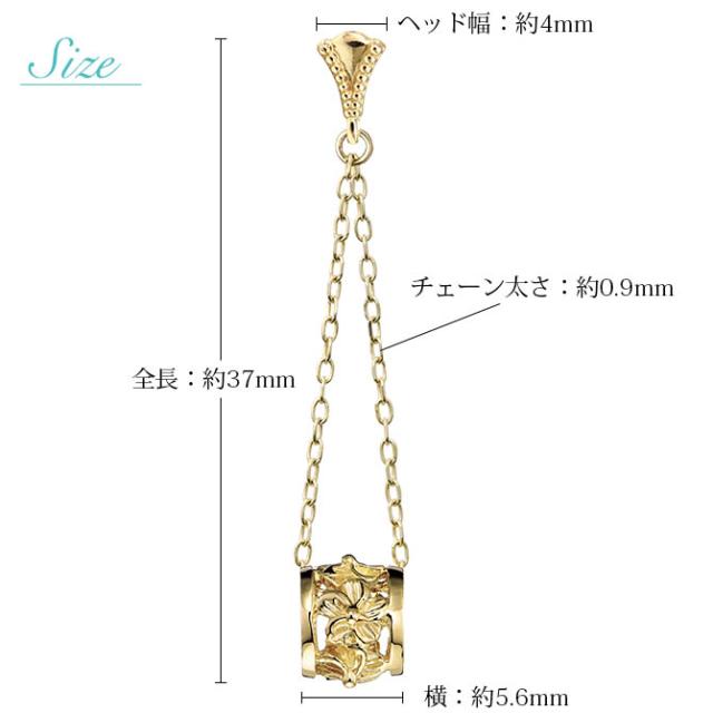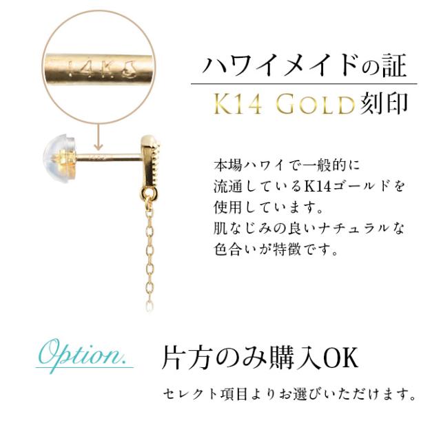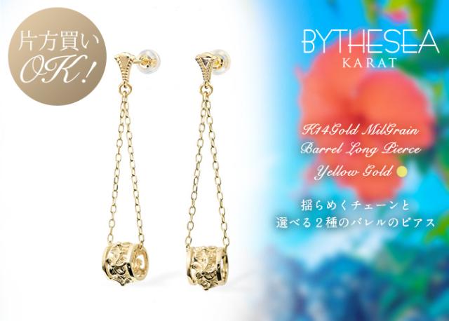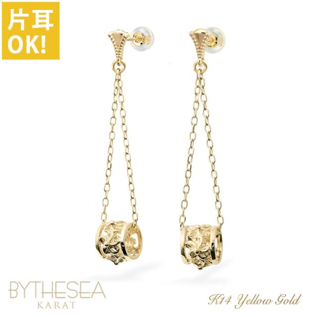 ハワイアンジュエリー ゴールド ピアス イエローゴールド ピアス 透かしバレル ミル打ち チェーン プルメリア ハイビスカス ミルグレイン 揺れる 片耳(1個)購入可 K14 シリコンキャッチ 20G ゲージ BY THE SEA バイザシー プレゼント ホワイトデー 【品番:GE312】