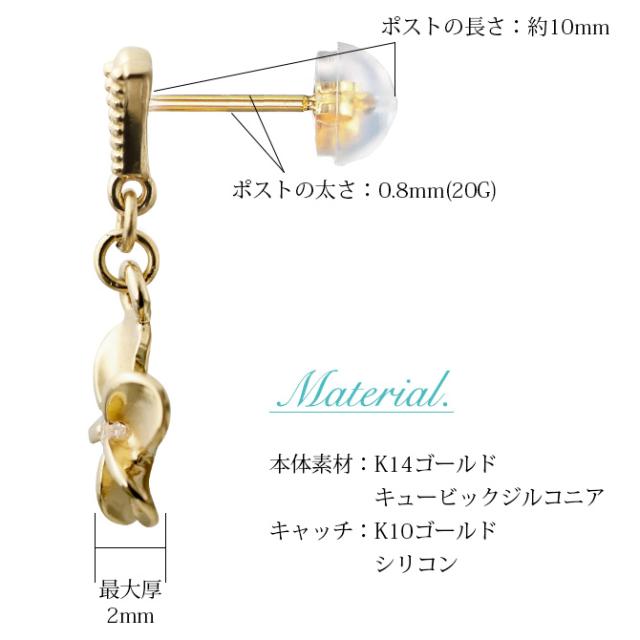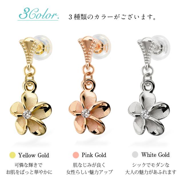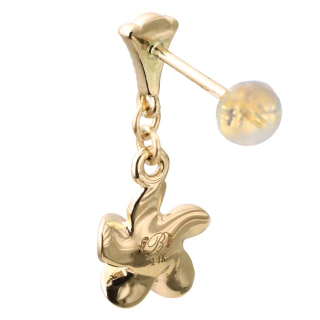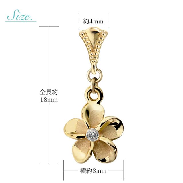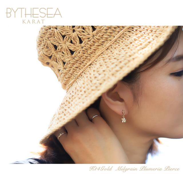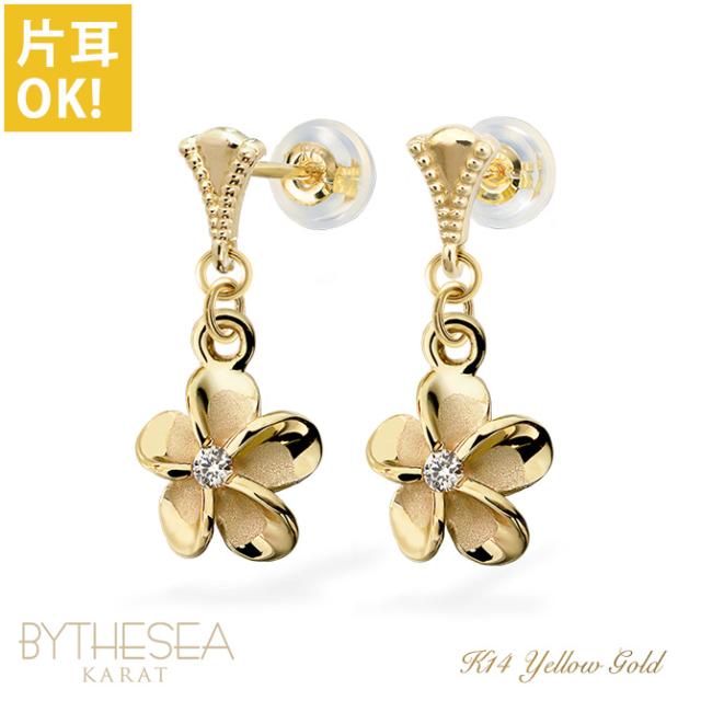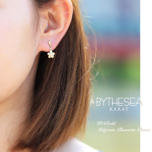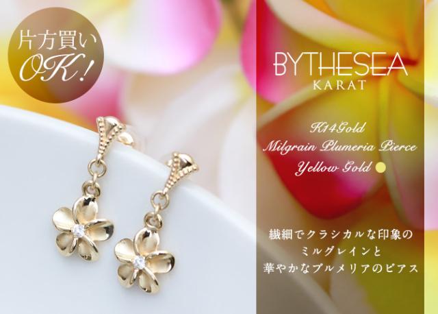 ハワイアンジュエリー ゴールド ピアス プルメリア イエローゴールド ピアス ミル打ち ジルコニア ミルグレイン 片耳(1個)購入可 K14 14K シリコンキャッチ 20G ゲージ BY THE SEA バイザシー 彼女 妻 女性 レディース 誕生日 プレゼント クリスマス 【品番:GE411】