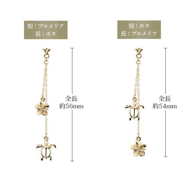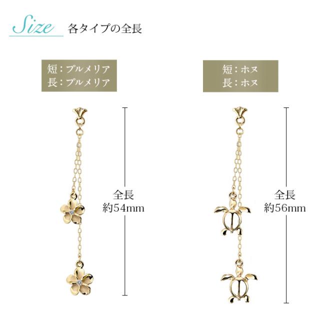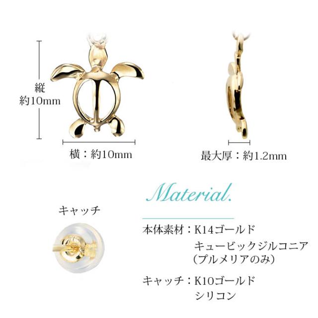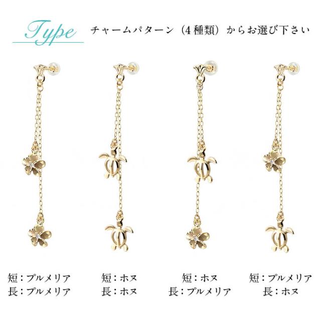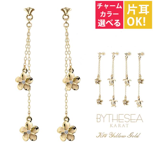 ハワイアンジュエリー ゴールド ピアス ホヌ イエローゴールド ピアス フレア 2チャーム ホヌ プルメリア チェーン 片耳 1個 購入可 K14 14K シリコンキャッチ 20G ゲージ BY THE SEA バイザシー 彼女 妻 女性 レディース プレゼント ホワイトデー 【品番:GE622】