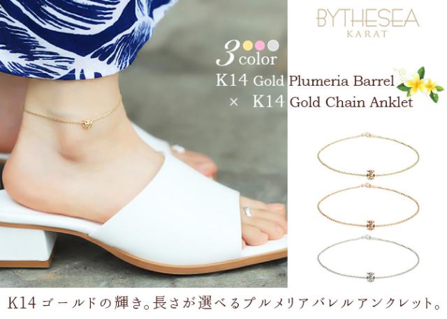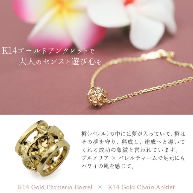 ハワイアンジュエリー ゴールド アンクレット プルメリア 透かし バレル 樽 K14ゴールド チャーム K14ゴールド太1.4mmカットあずきチェーン 長さ 選べる 20cm〜25cm パーツ ブランド 彼女 妻 女性 レディース プレゼント クリスマス 【品番:GP105-CH1020-A】