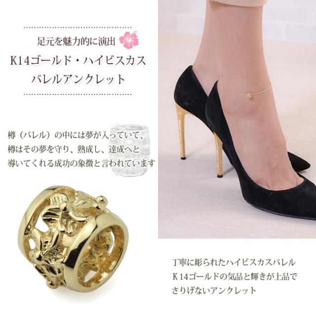 ハワイアンジュエリー ゴールド アンクレット ハイビスカス 透かし バレル 樽 K14ゴールド チャーム K10ゴールド太1.5mmあずきチェーン 長さ 選べる 20cm〜25cm パーツ ブランド 彼女 妻 女性 レディース 誕生日 プレゼント クリスマス 【品番:GP106-CH176-A】
