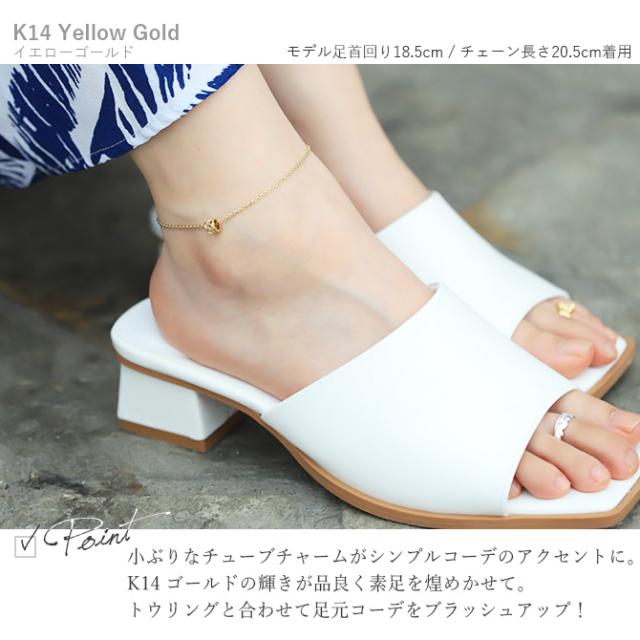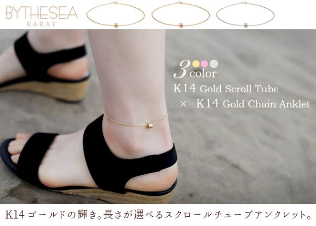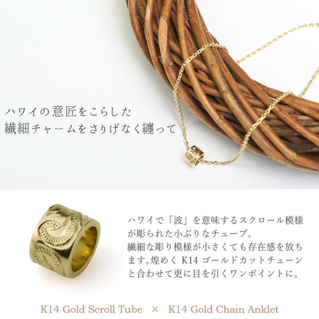 ハワイアンジュエリー ゴールド アンクレット スクロールチューブ K14ゴールド チャーム K14ゴールド太1.4mmカットあずきチェーン 長さ選べる20cm〜25cm パーツ ブランド BY THE SEA バイザシー メンズ レディース 誕生日 クリスマス 【品番:GP127-CH1020-A】