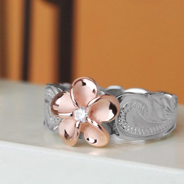 スクロール模様に華麗なワンポイントのプルメリアが美しいリングです