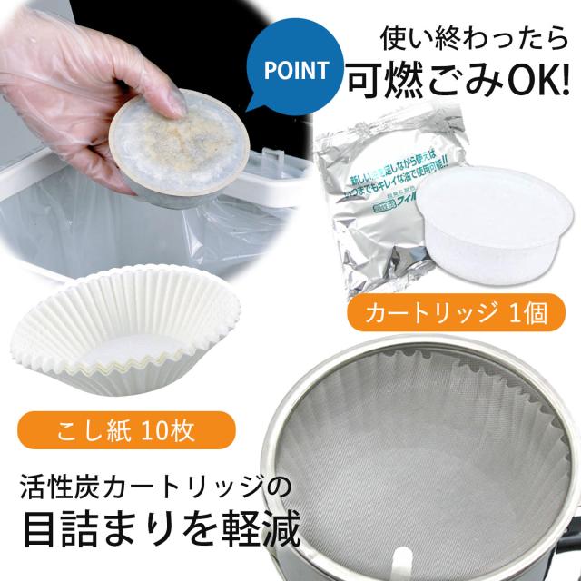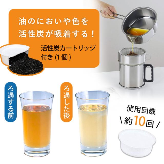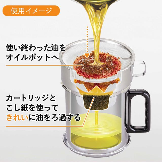 活性炭カートリッジで油のイヤな臭いをカット。から揚げ後の油もキレイにできるようになりました!口径が大きく、油を楽に早く入れられます。上側のこし網で天カス等を除き、更に活性炭入りの下側のこし網が汚れや臭いを取り除くので、いつでも油がリフレッシュ!専用のこし紙を使うことで、から揚げで汚れた油もキレイにすることが可能になりました。
