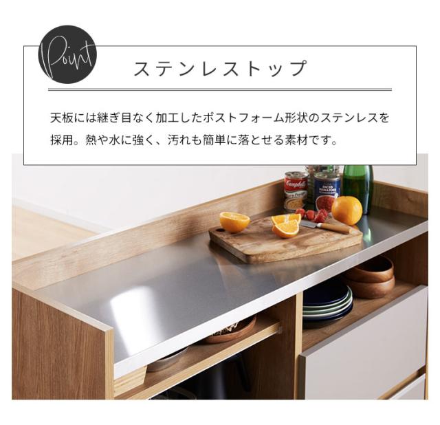 天板トップはポストフォーム形状のステンレストップ天板を採用。耐熱、耐水、汚れも簡単に落とせる素材です。