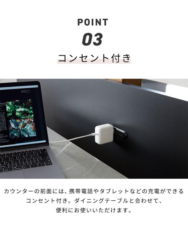 カウンターの前面には携帯電話やタブレットなどの充電ができる便利なコンセント付き。