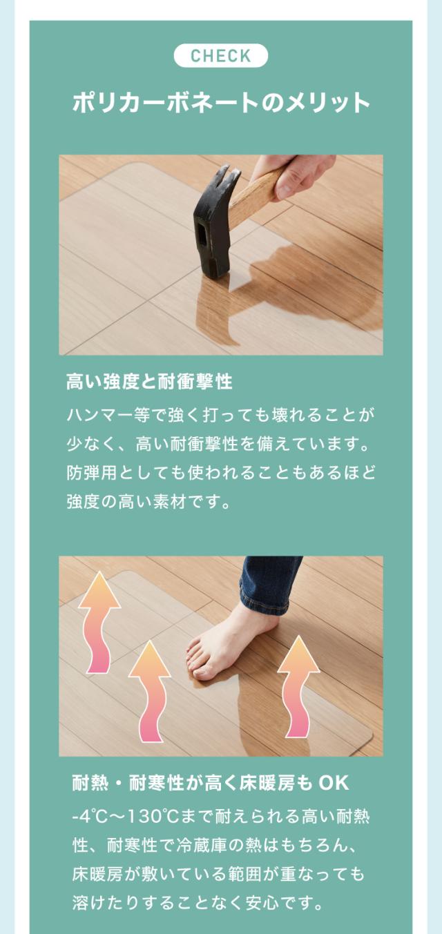 ポリカーボネートマット、ポリカーボネートパネル、冷蔵庫下保護シート、家電用耐熱マット、耐熱パネル、保護パネル、冷蔵庫下マット、クリアマット、クリアパネル、割れない、滑り止め、厚手、強度UP、安定、たわみ防止