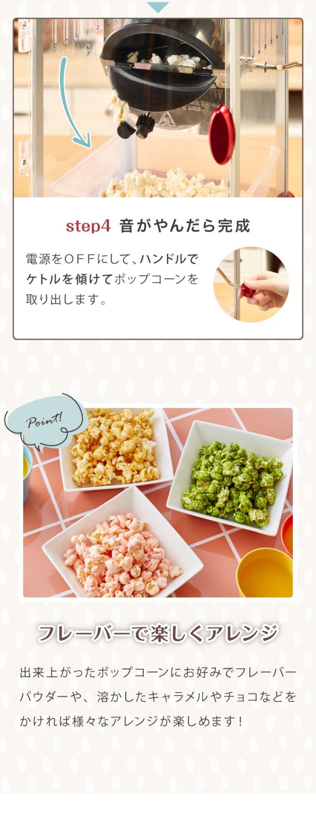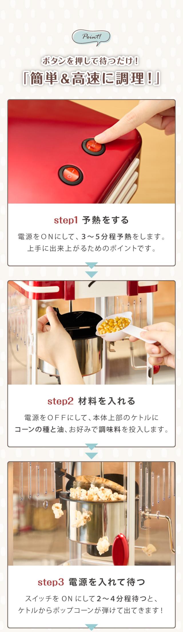 事前にプレヒート(予熱)をして、材料を投入すればわずか2〜4分で完成!ボタン一つで誰でも簡単にポップコーンが作れます。