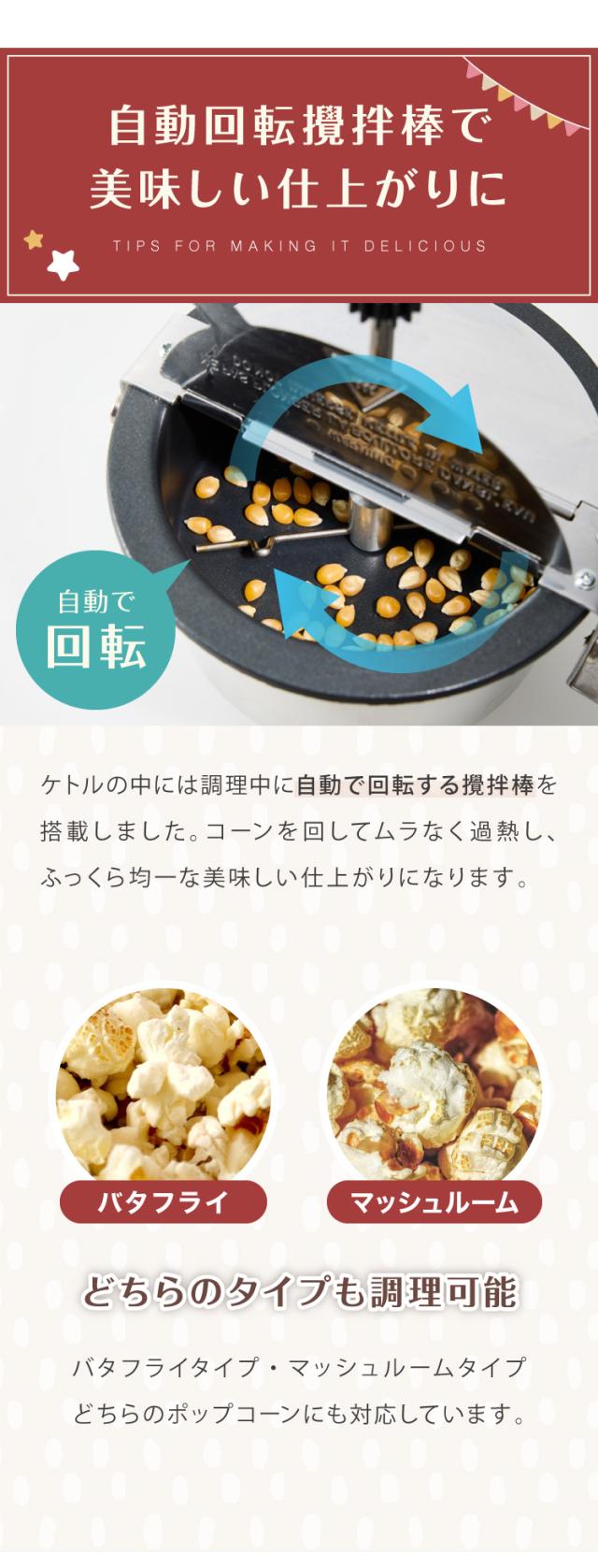 内部にはステンレス製の攪拌棒を内蔵。スイッチを入れると自動で回転し、トウモロコシをムラなく加熱。ふっくらとしたおいしいポップコーンに仕上がります。