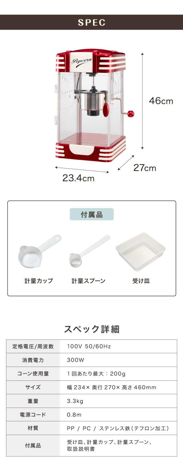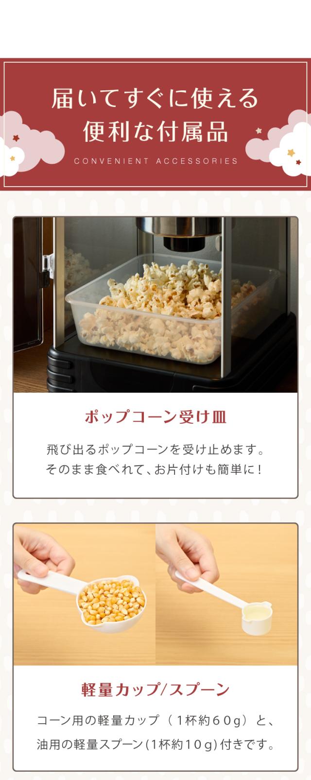**計量スプーン(油用・コーン用 各1個)と、出来上がったポップコーンをそのまま受け取れる専用トレイ(皿)**が付属。取り出しやすく、お手入れもラクラクです。