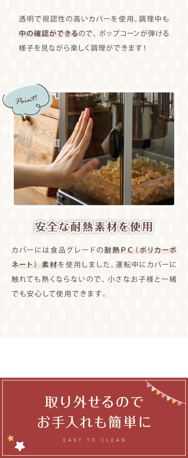 側面カバーには食品グレードの耐熱PC素材(ポリカーボネート)を使用。透明で視認性が高く、安心安全&楽しい調理体験が可能です。