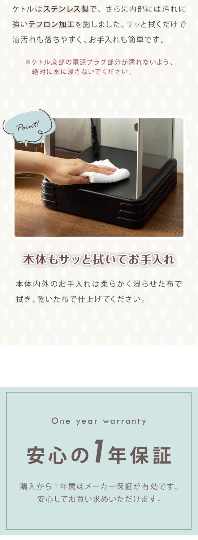 内釜(ケトル)は高品質なステンレス製で、内側はテフロン加工済み。使った後もさっと拭くだけで清潔を保て、毎回の使用が億劫になりません。